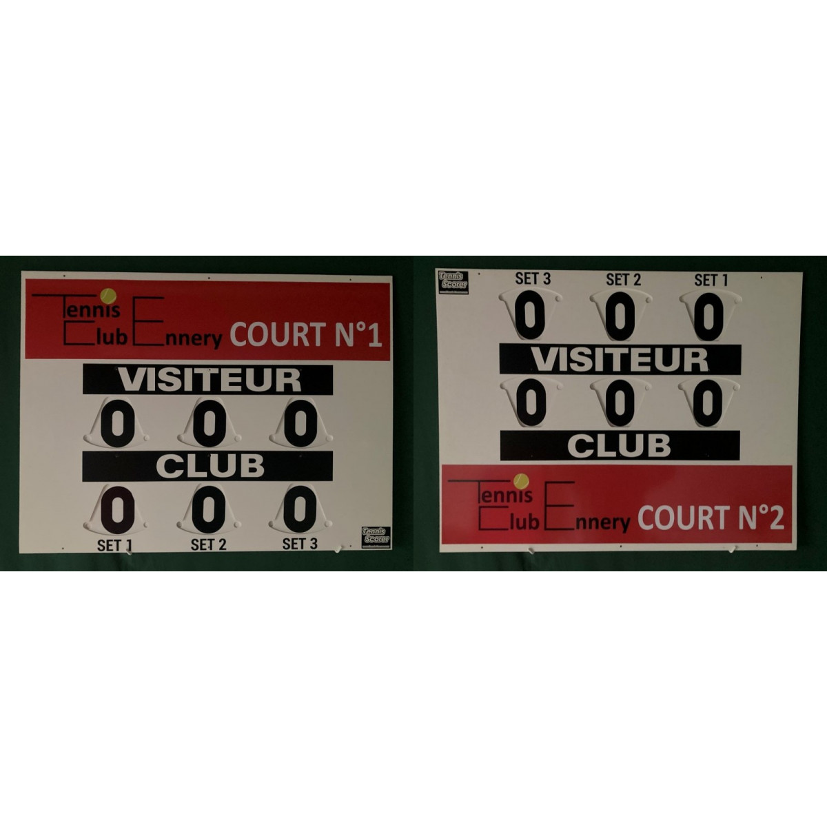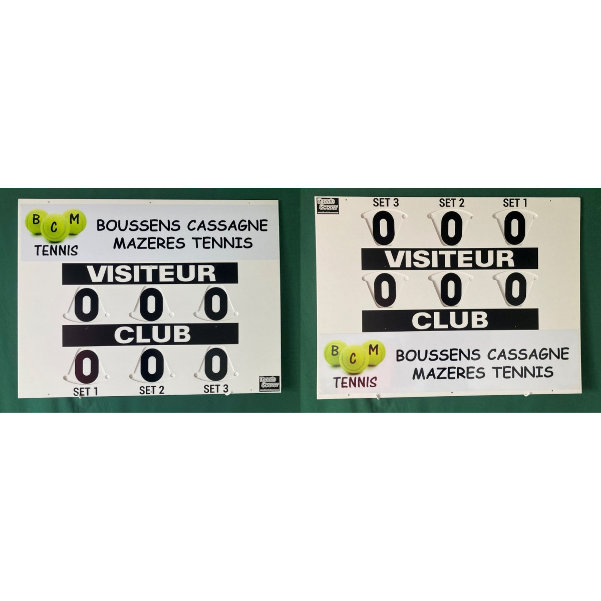 Possibilité d'une personnalisation totale du tableau par un habillage complet, aux couleurs du club, avec affichage spécifique du Nom du Club. Visuels de simulation sur demande à: contact@tennis-scorer.com ==> Tarif : + 25€ ttc par face pour le Modèle Compact ( soit 50€ pour le Recto Verso )