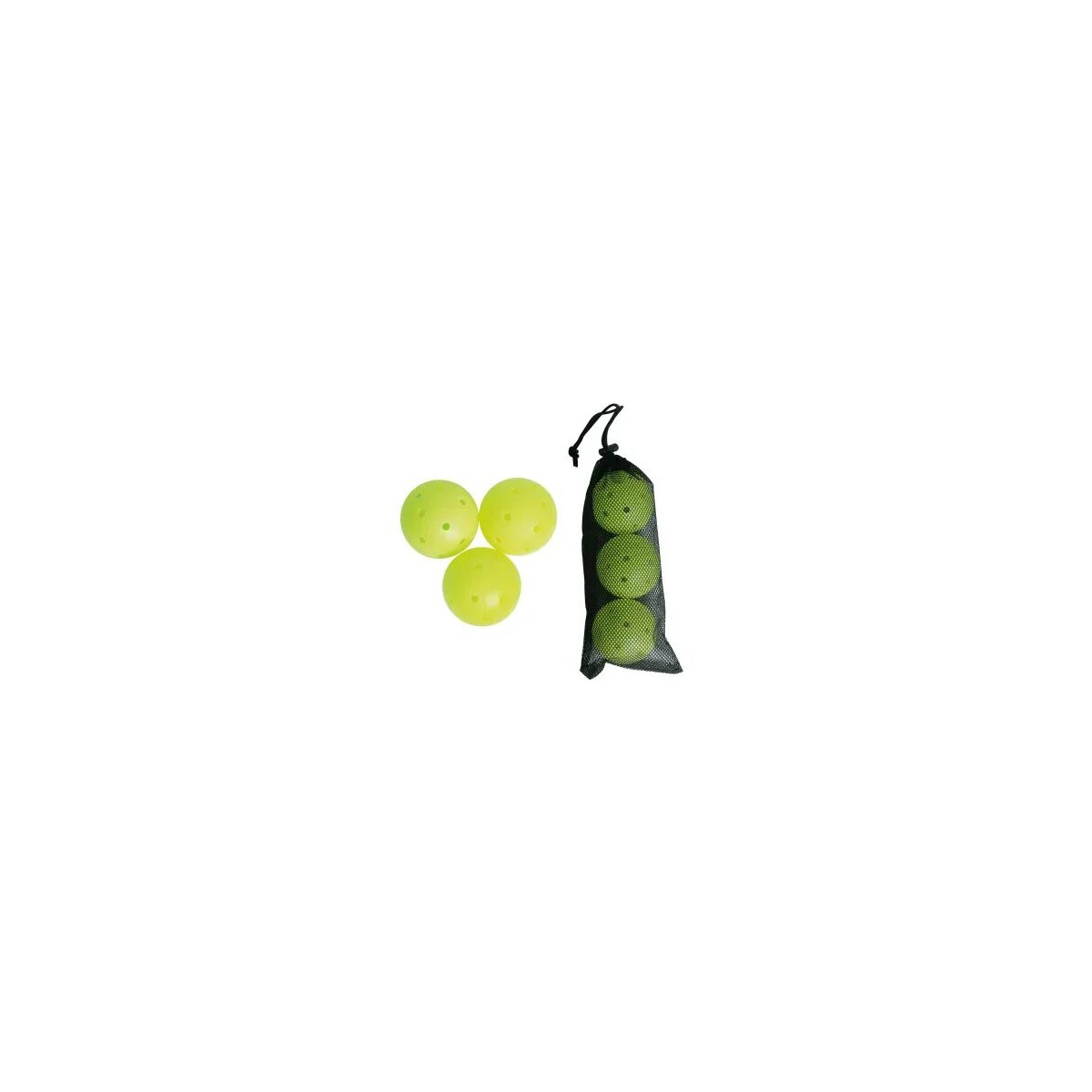 Lot de 3 balles de diamètre 74mm avec 26 trous conçues pour utilisation en intérieur. Vendu avec le filet mesh de transport. Matière : PE. Coloris : Vert Fluo.