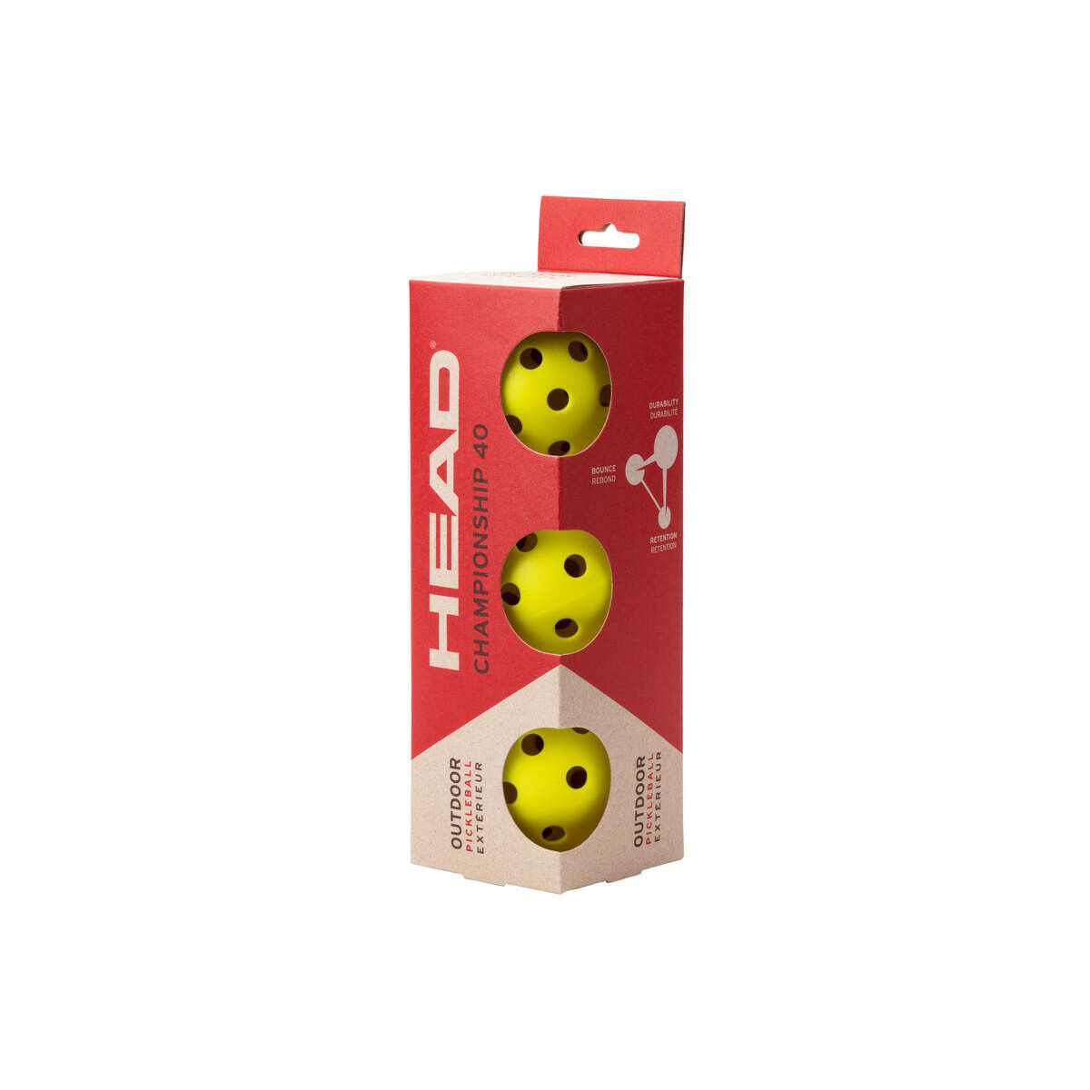 Le pack de 3 balles Head Championship 40 Outdoor est conçu pour offrir une performance optimale lors des parties de pickleball en extérieur. Ces balles sont fabriquées en plastique durable avec une construction monobloc, assurant une longévité accrue même lors d'utilisations intensives. Leur couleur jaune vif garantit une excellente visibilité sur le terrain, quelles que soient les conditions de luminosité. Homologuées par l'USAPA, elles conviennent aussi bien aux joueurs débutants qu'aux compétiteurs. Spécifications techniques Diamètre : 2,904 pouces (environ 73,8 mm) Poids : Environ 26 g Nombre de trous : 40 (petits trous pour une meilleure résistance au vent) Matériau : Plastique injecté monobloc Homologation : Conforme aux spécifications officielles du pickleball (USAPA) Conditionnement : Lot de 3 balles Points forts Rebond dynamique : Offre une trajectoire stable et un rebond constant. Visibilité accrue : Couleur jaune vif pour une meilleure détection en extérieur. Durabilité : Conception monobloc résistante aux chocs et à l'usure. Polyvalence : Adaptée à tous les niveaux de jeu et aux compétitions officielles.