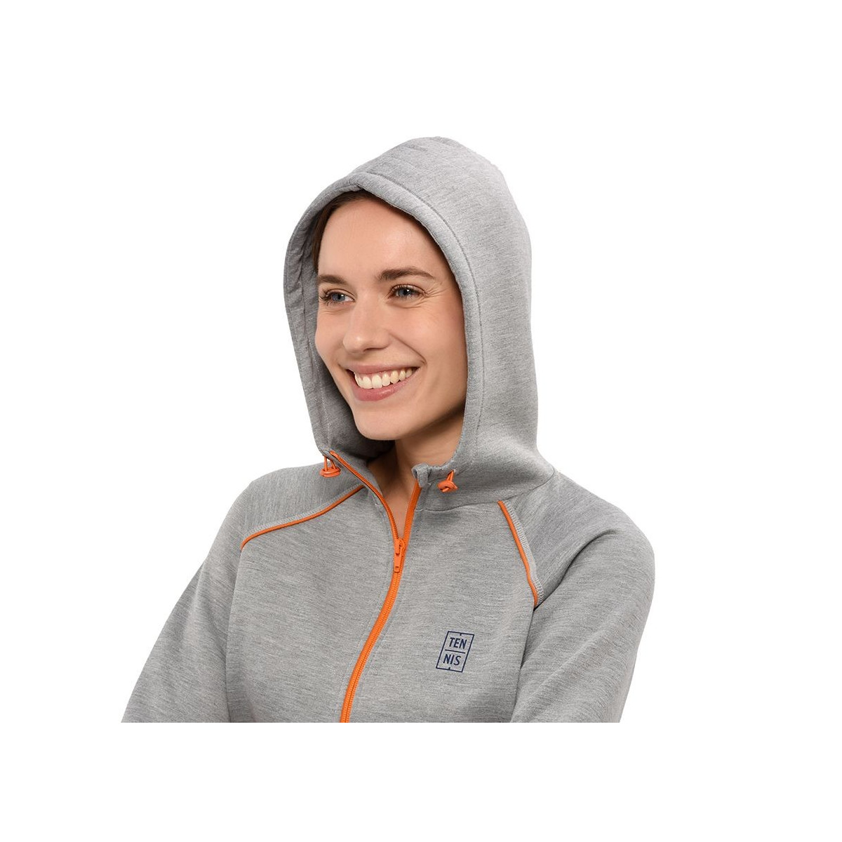 Très pratique et confortable, ce sweat gris chiné double face est équipé d'une capuche doublé, de liens resserants et stoppers en coloris terre battue.