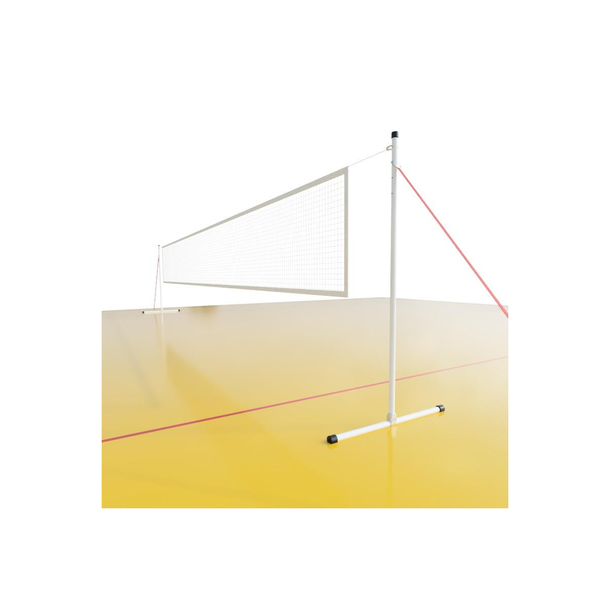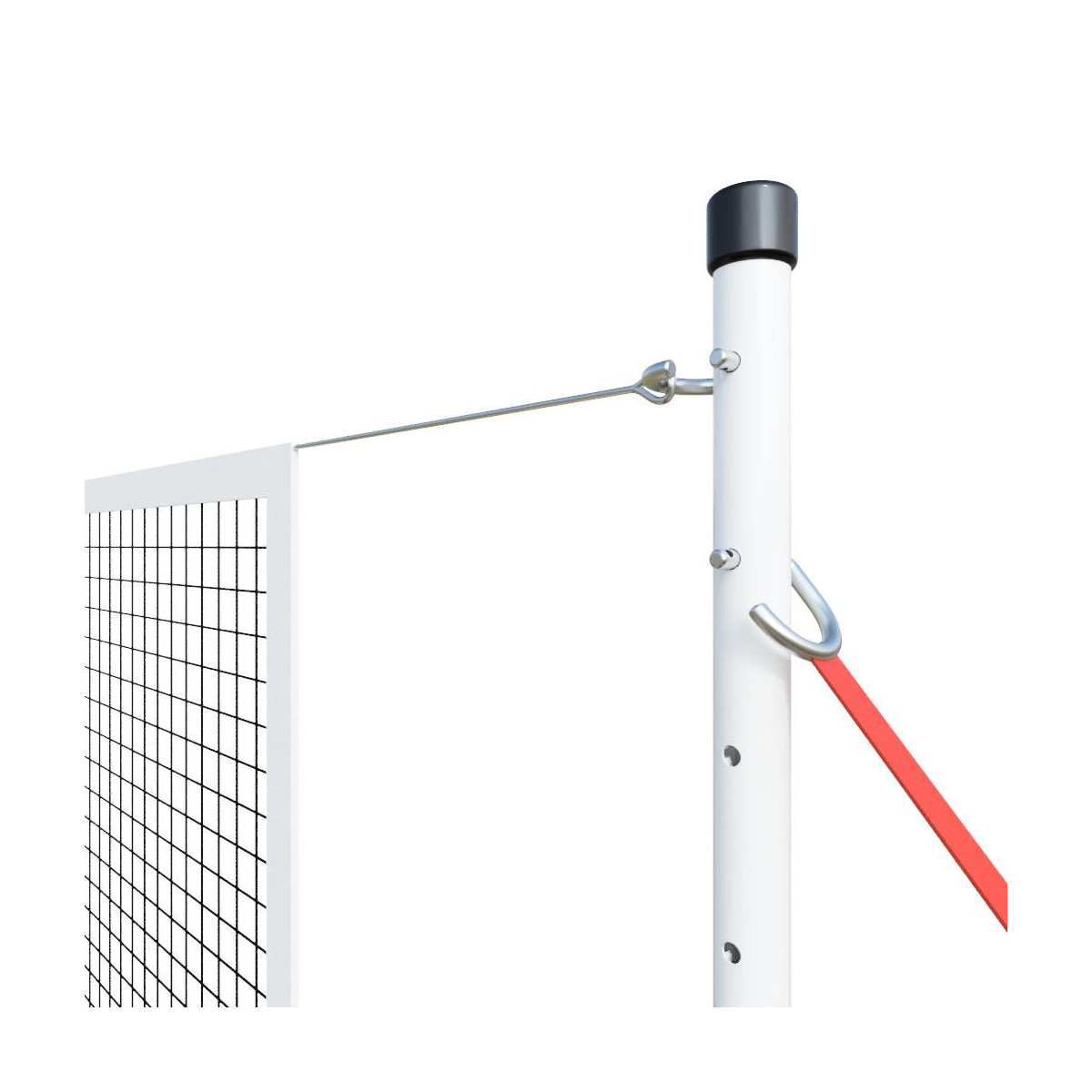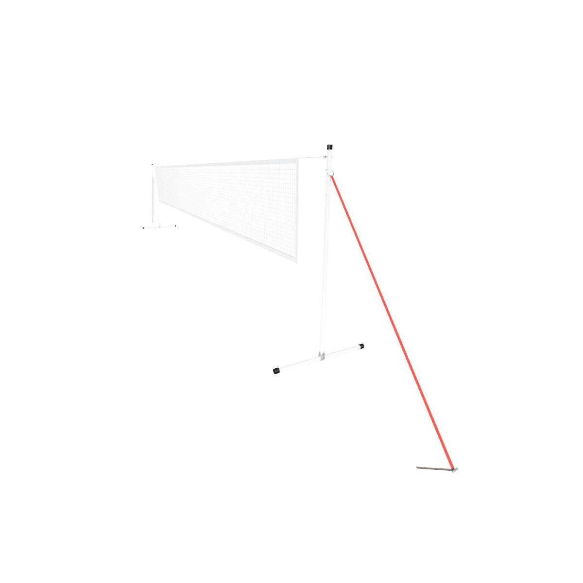 Sur chaque poteau, un manchon et une goupille permettent à la fois de verrouiller la hauteur et de fixer la sangle de tension du poteau et le câble du filet.