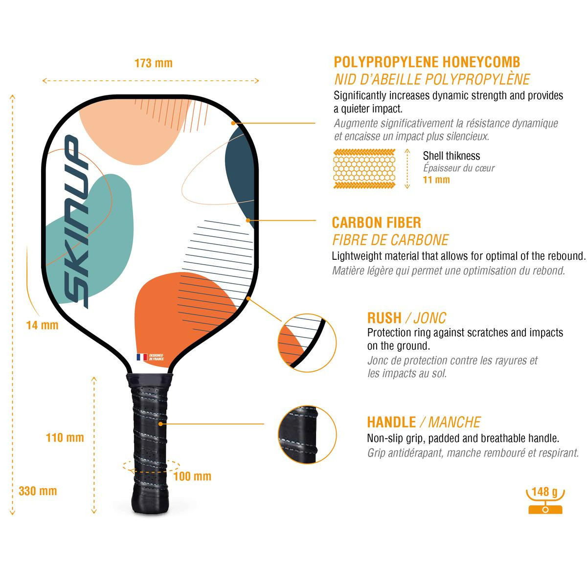 - Sa structure qui procure un parfait équilibre entre contrôle et puissance grâce à son cœur en nid d’abeille en polypropylène. La surface en fibre de carbone procure un bon rebond. Légère (150 g), durable et équilibrée, c’est la combinaison préférée de la plupart des jeunes joueurs. Ces matériaux avant-gardistes apportent légèreté et résistance, tout en fournissant un excellent effet et une puissance à la balle lors de la frappe.