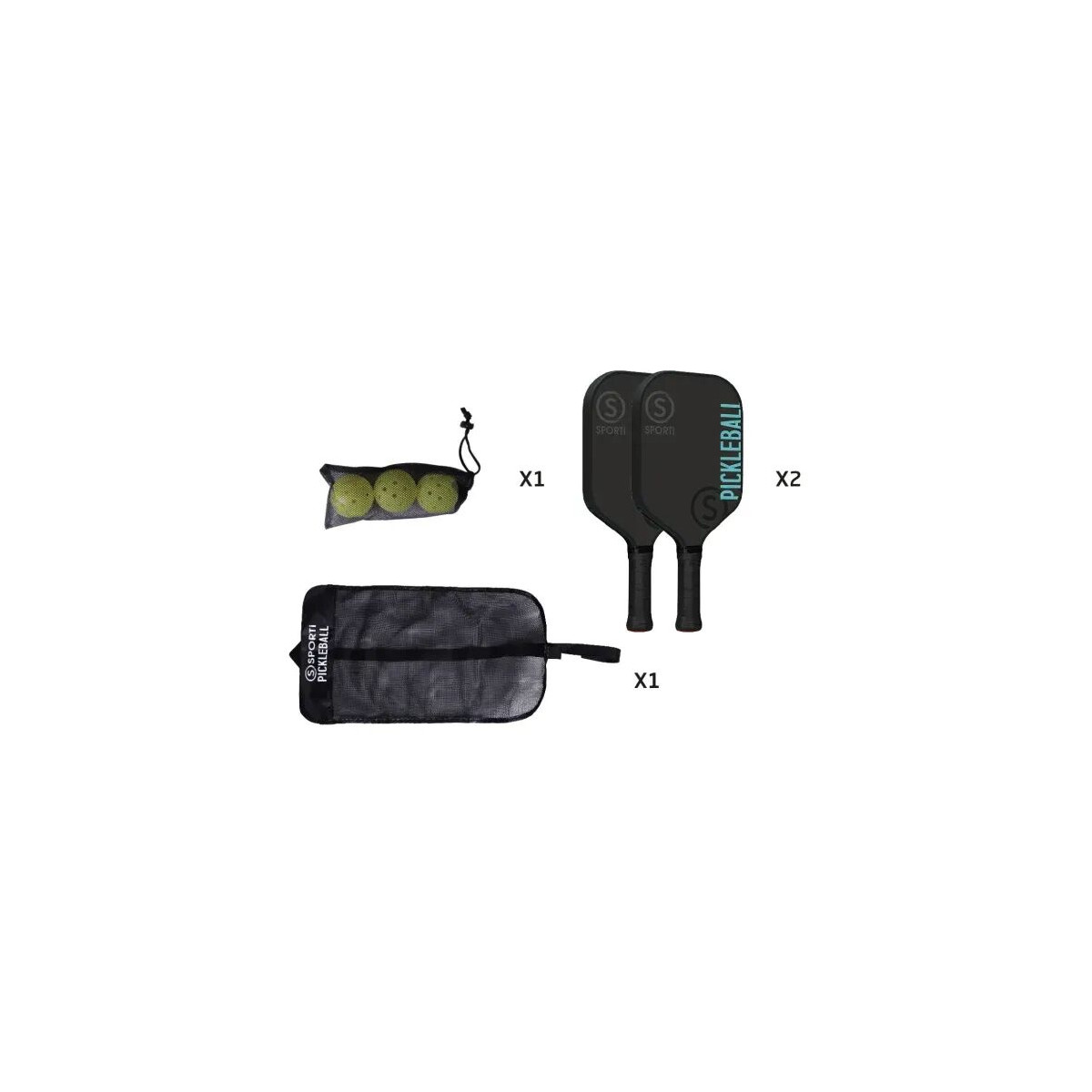 Ce kit Pickleball est composé de 2 raquettes Bois + 1 sac mesh + 1 lot de 3 balles extérieures.