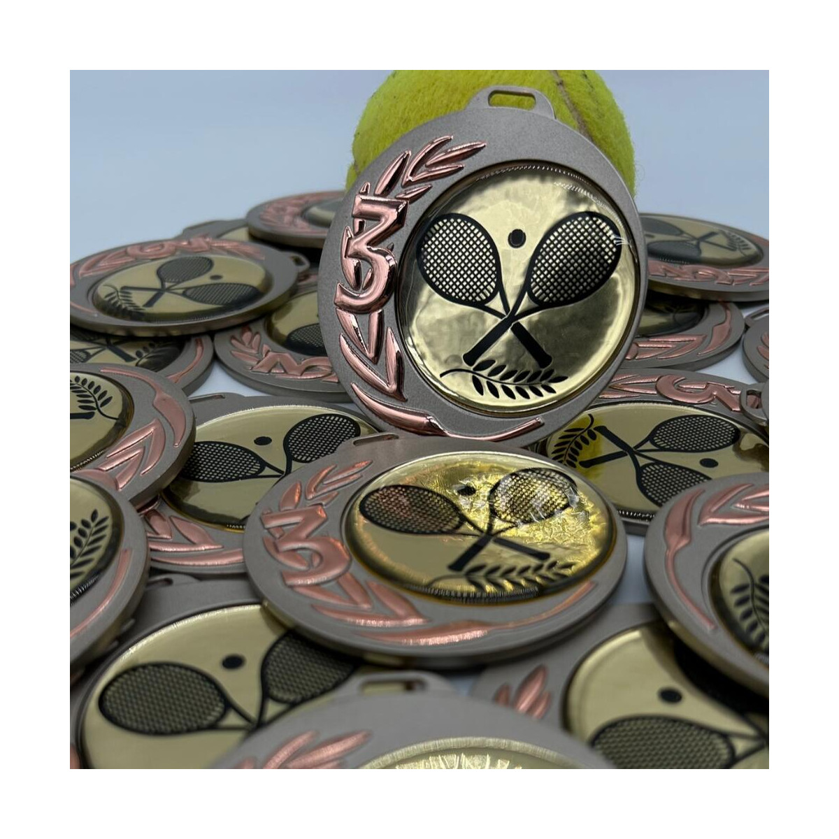 Visuel : Branche de Laurier avec numéro 1 (Or), 2 (Argent) et 3 (Bronze) / centre raquette de tennis sur fond doré.