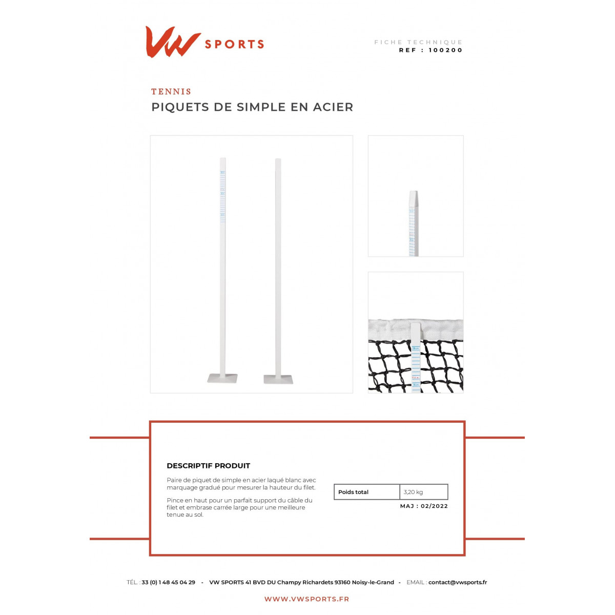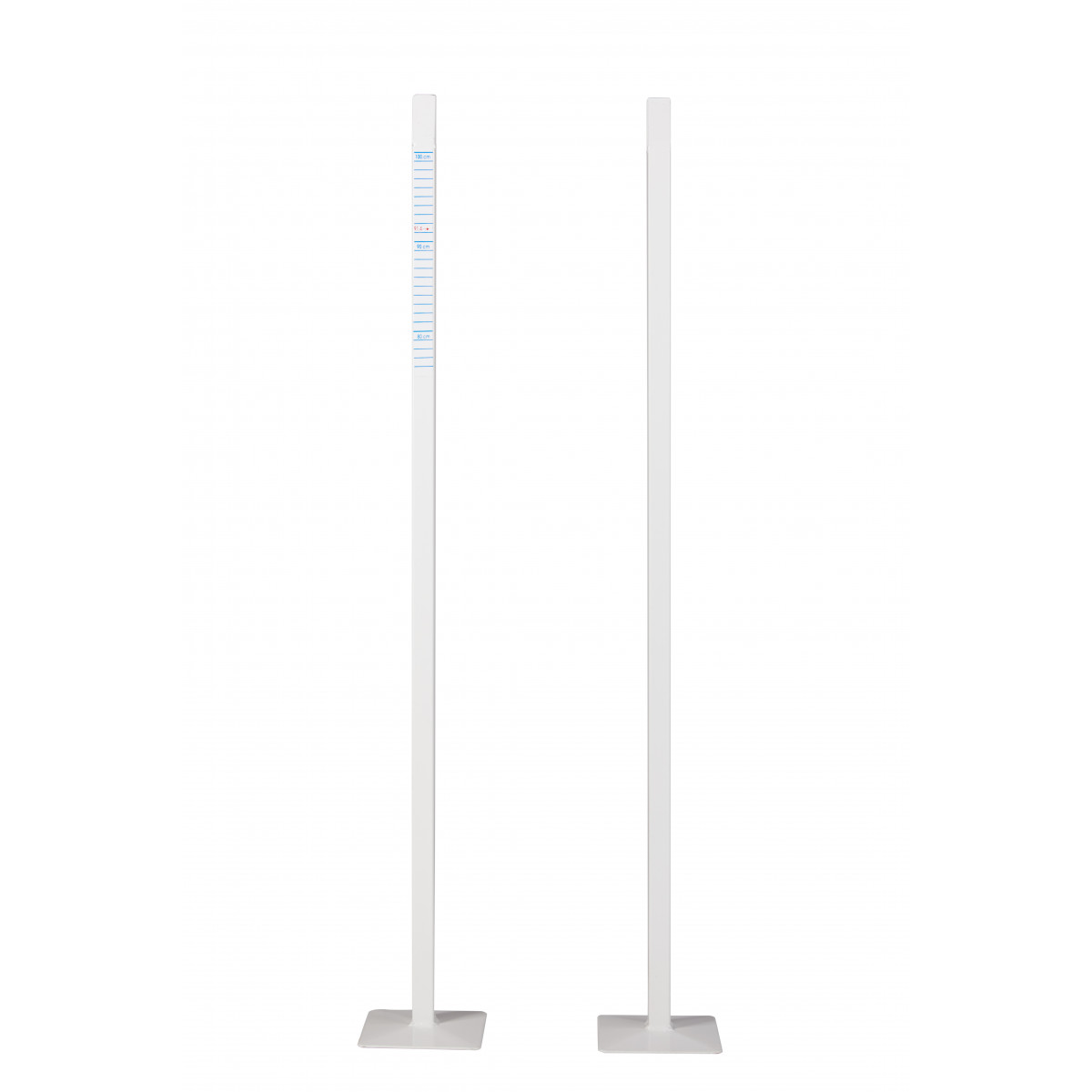 Paire de piquets de simple en acier laqués blancs avec marquage gradué pour mesurer la hauteur du filet.