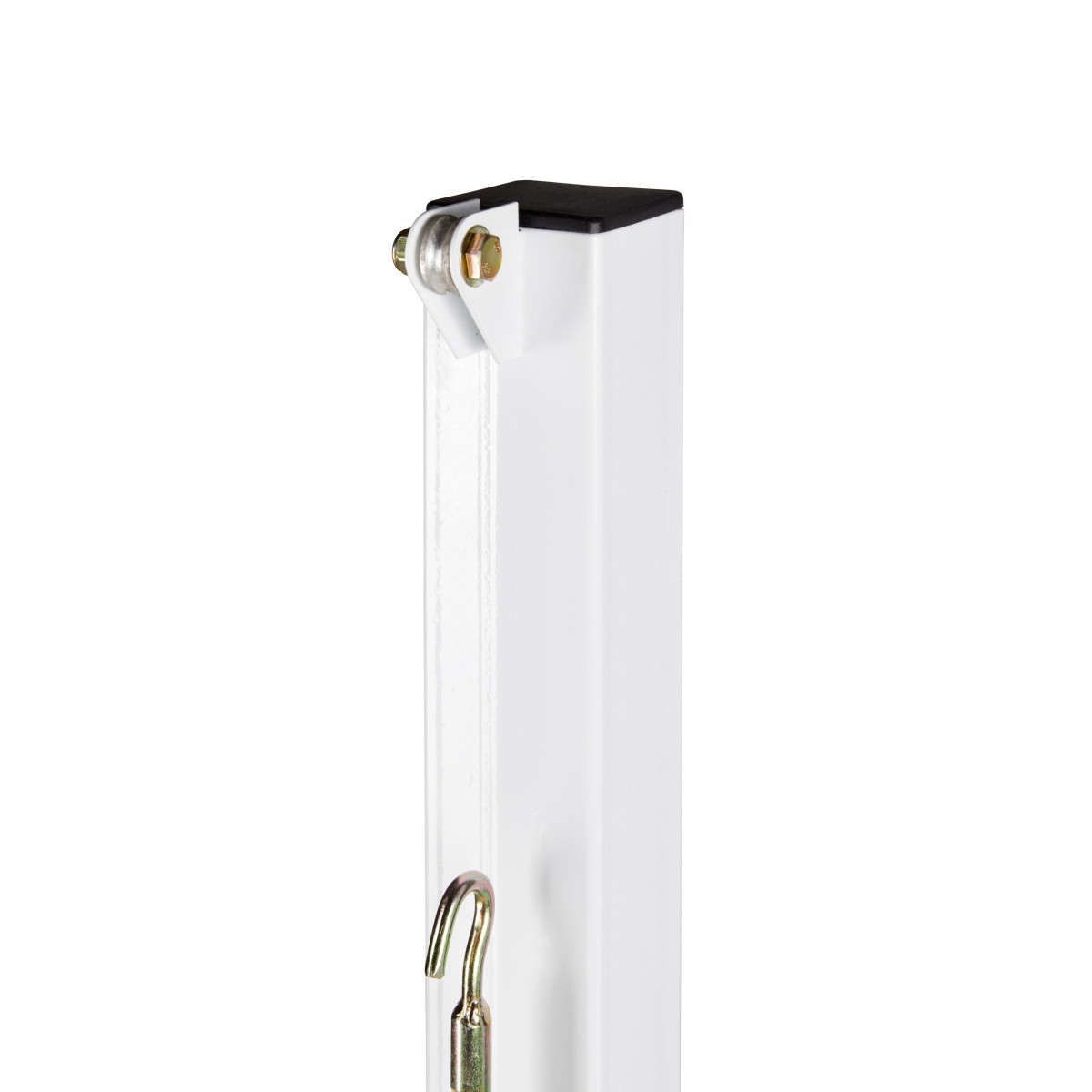 Paire de poteaux de tennis en acier carrés, laqués blancs 80 x 80 mm, à fourreau avec le treuil à crémaillère extérieur en alliage moulé.
