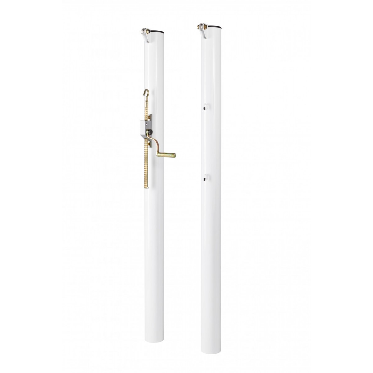 Paire de poteaux de tennis en acier ronds laqués blancs Ø 90 mm, à fourreau avec le treuil à crémaillère extérieur en alliage moulé.