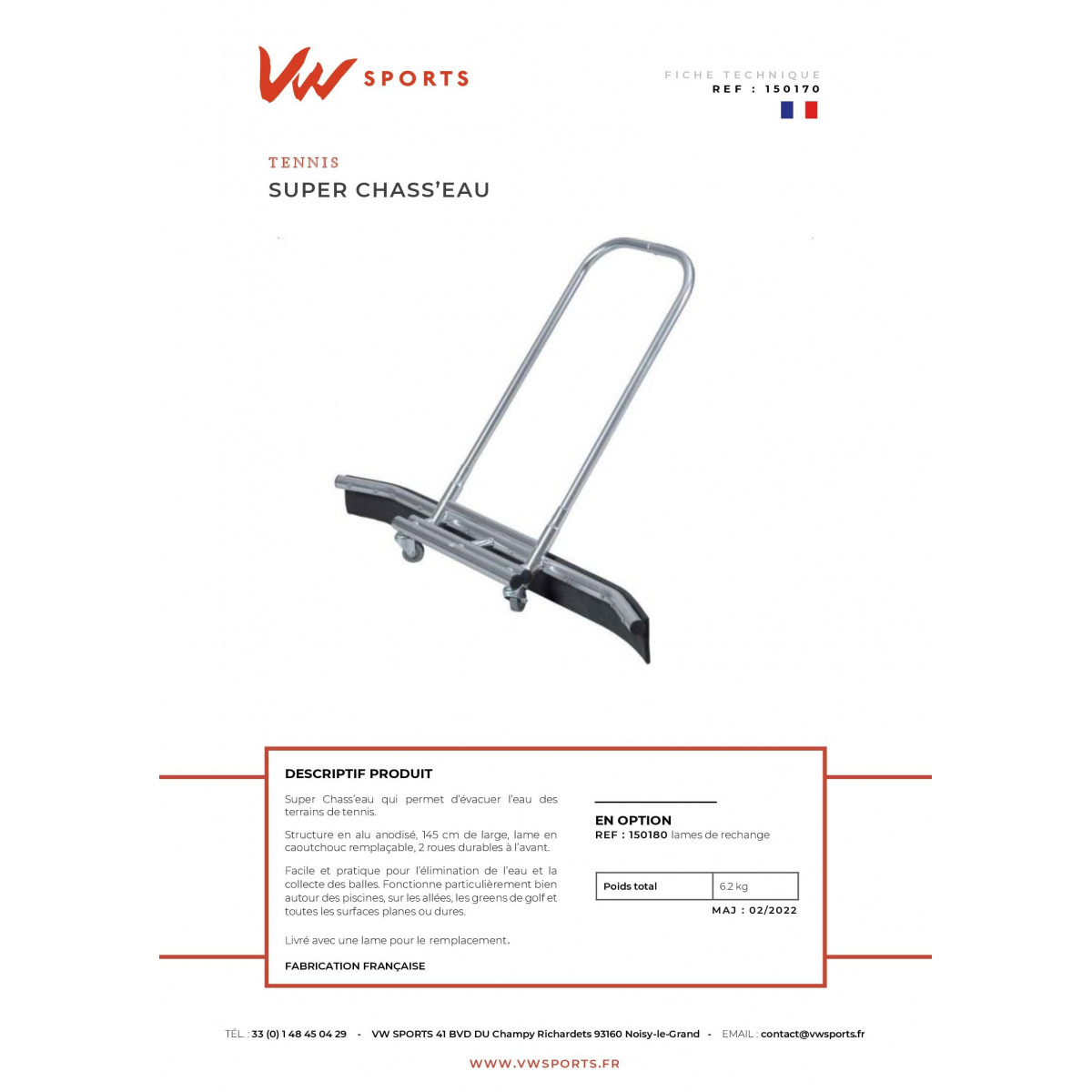 Sa largeur de travail de 1.45 m, le rend très efficace car très rapide pour évacuer l’eau sur 1 terrain complet.